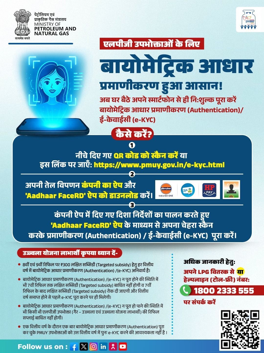 यदि आप प्रधानमंत्री उज्ज्वला योजना (PMUY) के लाभार्थी हैं, तो e-KYC आपके लिए अनिवार्य (Mandatory) है।